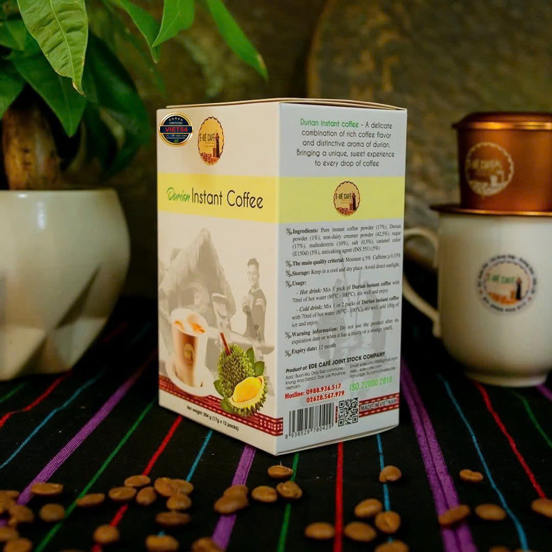 Cà Phê Sầu Riêng là sự kết hợp độc đáo giữa hạt cà phê rang xay nguyên chất và sầu riêng thơm béo đặc trưng. Công thức pha chế hiện đại giữ trọn hương vị đậm đà của cà phê, đồng thời tạo nên hậu vị ngọt béo, khó quên từ sầu riêng. Sản phẩm không chất bảo quản – không phẩm màu – không hương liệu nhân tạo, an toàn cho sức khỏe.