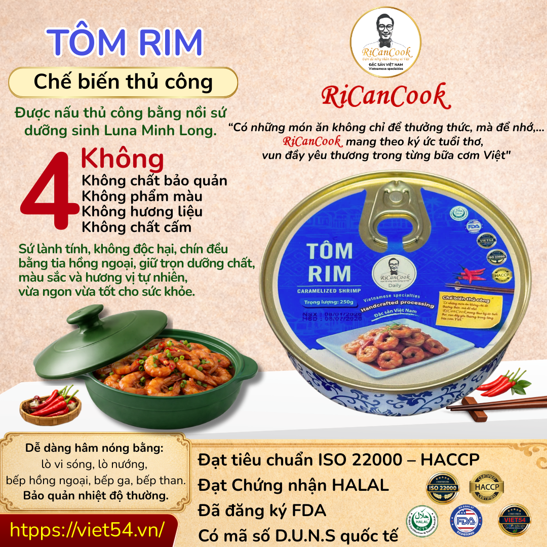 Tôm Rim được chế biến từ tôm tươi chiếm 48%, rim kỹ cùng gừng, sả và các gia vị truyền thống, tạo nên phần sốt sánh mịn, mặn ngọt hài hòa, thơm nồng hấp dẫn. Tôm giữ được độ săn chắc, ngọt thịt, thấm đều gia vị, rất thích hợp dùng với cơm trắng, xôi, cháo hoặc làm món mặn tiện lợi cho bữa ăn nhanh.