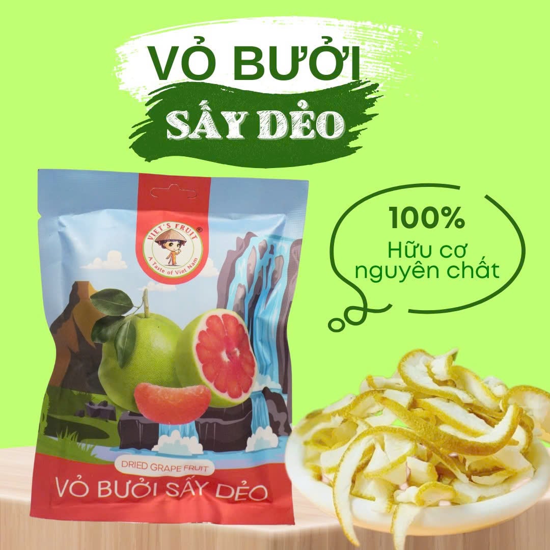 Vỏ Bưởi Sấy Dẻo được chế biến từ vỏ bưởi tươi tự nhiên, qua quy trình sấy dẻo hiện đại, giữ nguyên hương thơm đặc trưng và vị the mát nhẹ nhàng. Đây là món ăn vặt độc đáo, ngọt thanh, dẻo dai, vừa ngon miệng vừa mang lại nhiều lợi ích cho sức khỏe.