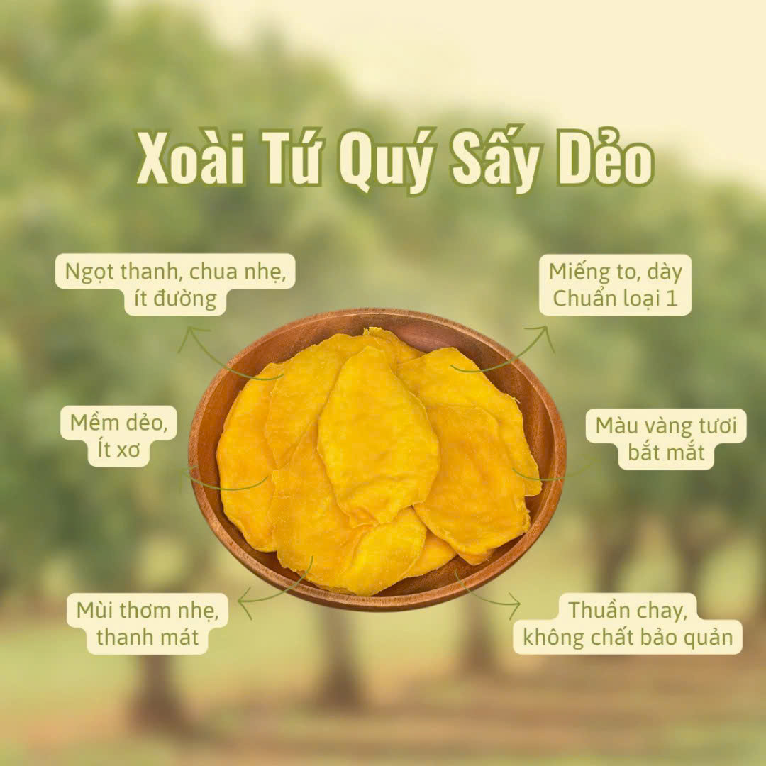 Xoài Tứ Quý sấy dẻo được tuyển chọn từ những trái xoài chín mọng, có độ ngọt thanh đặc trưng. Trái xoài sau khi sơ chế được sấy bằng công nghệ hiện đại, giữ trọn hương vị tự nhiên, không chất bảo quản, không phẩm màu.